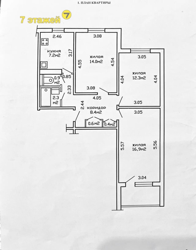 Общая площадь 63,0 м2, жилая - 43,2 м2, кухня - 7,2 м2.