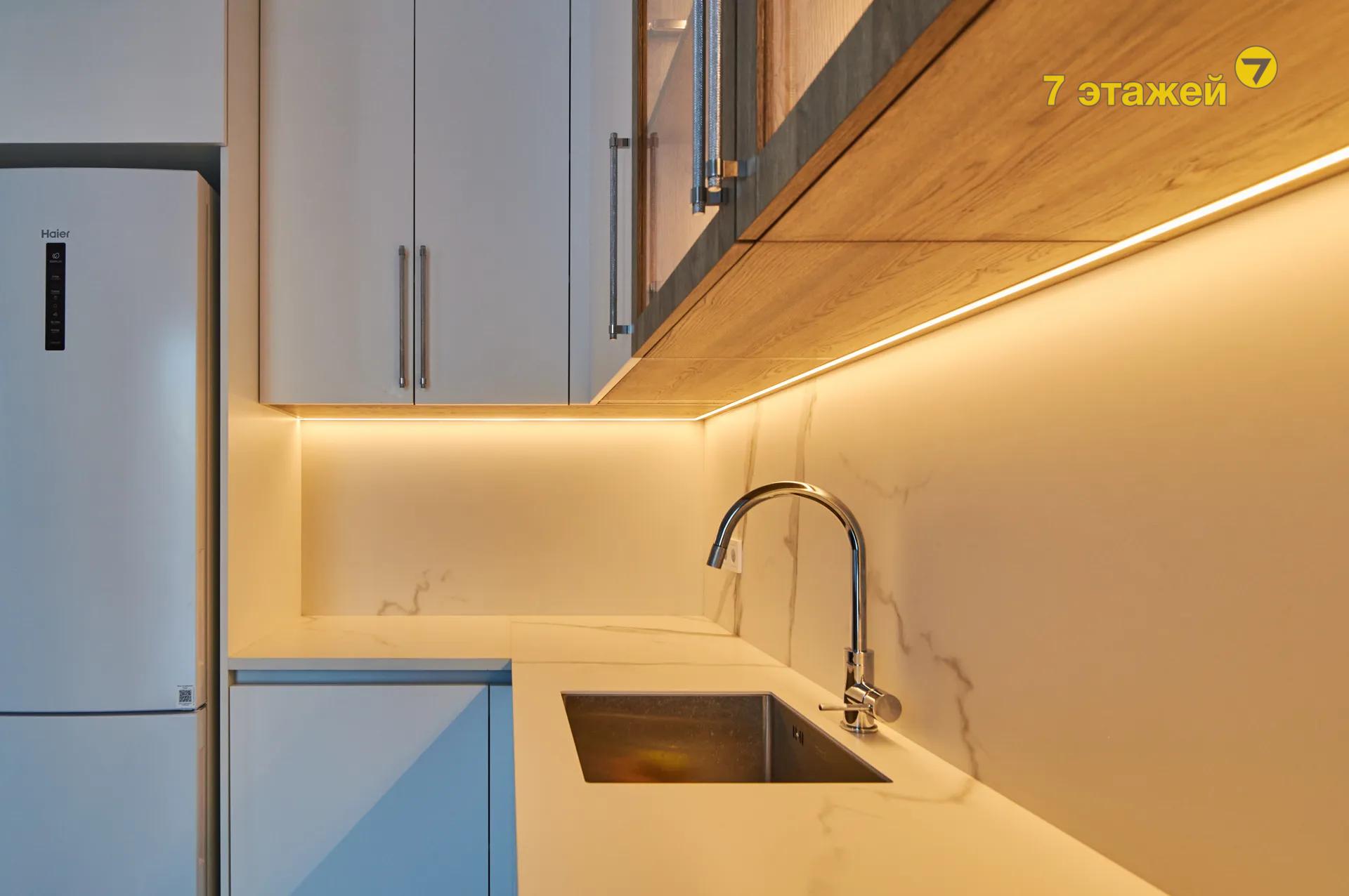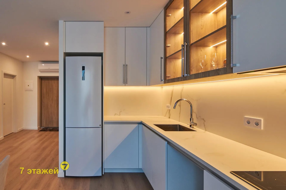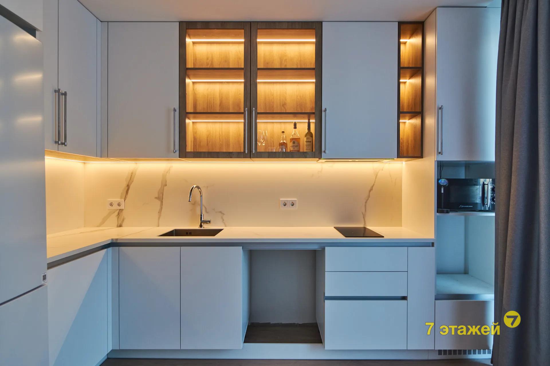 - просторная рабочая зона кухни со всей необходимой встроенной техникой (по желанию покупатель может установить посудомоечную машину либо оставить в нише зону хранения)