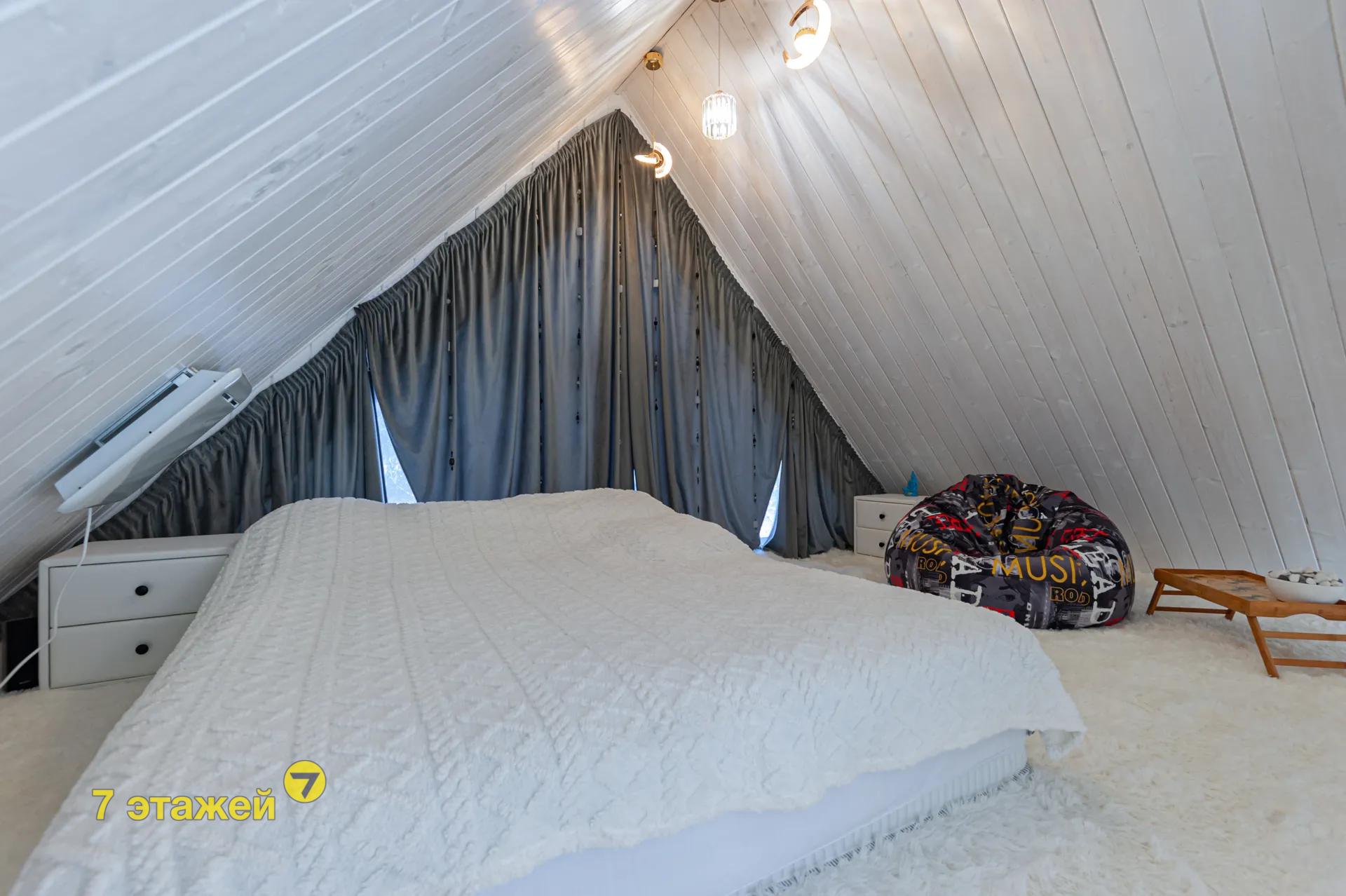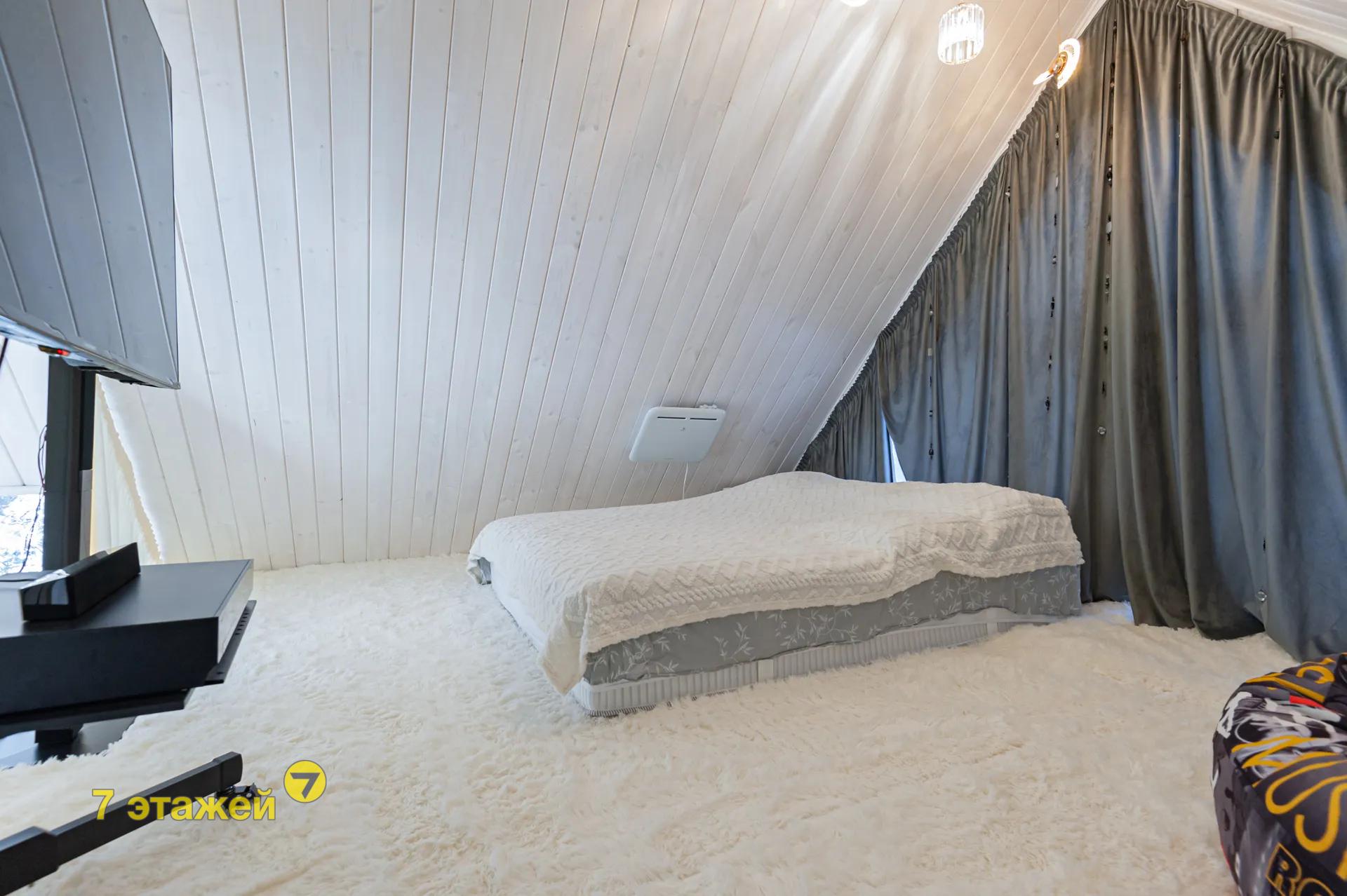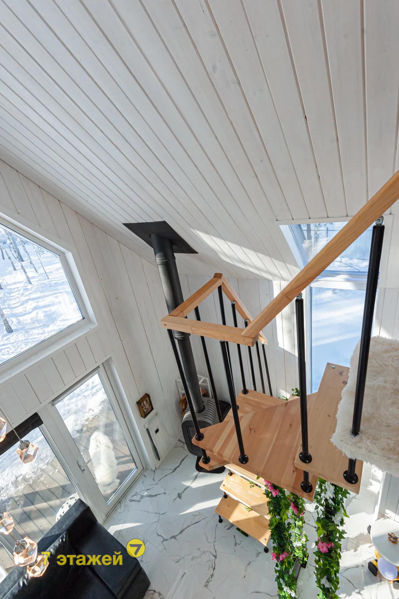 На втором этаже просторная жилая комната. Стены и потолок в доме, обшиты вагонкой.