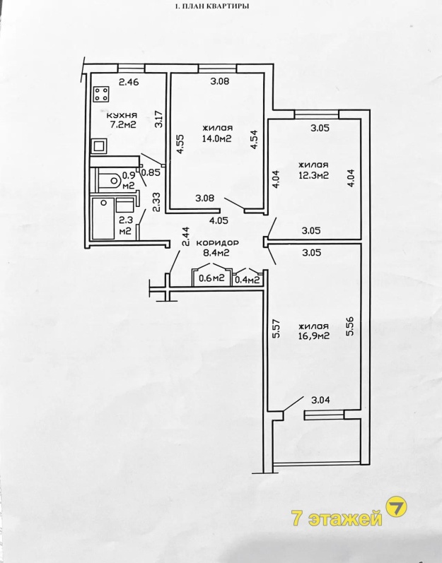 Общая площадь 63,0 м2, жилая - 43,2 м2, кухня - 7,2 м2.