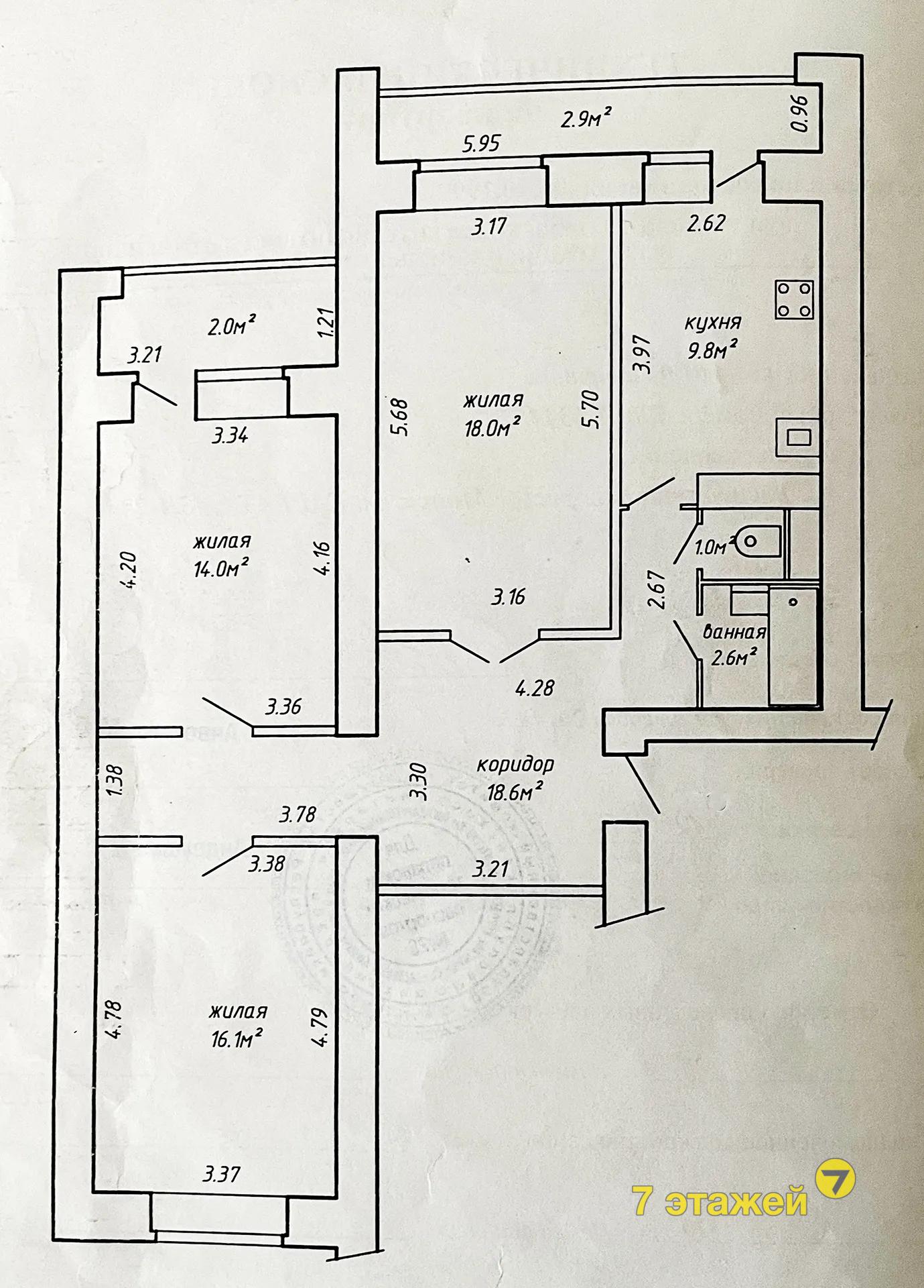 Общая площадь по СНБ 85 кв.м, общая - 80,1 кв.м, жилая – 48,1 кв.м, кухня - 9,8 кв.м с выходом на лоджию.