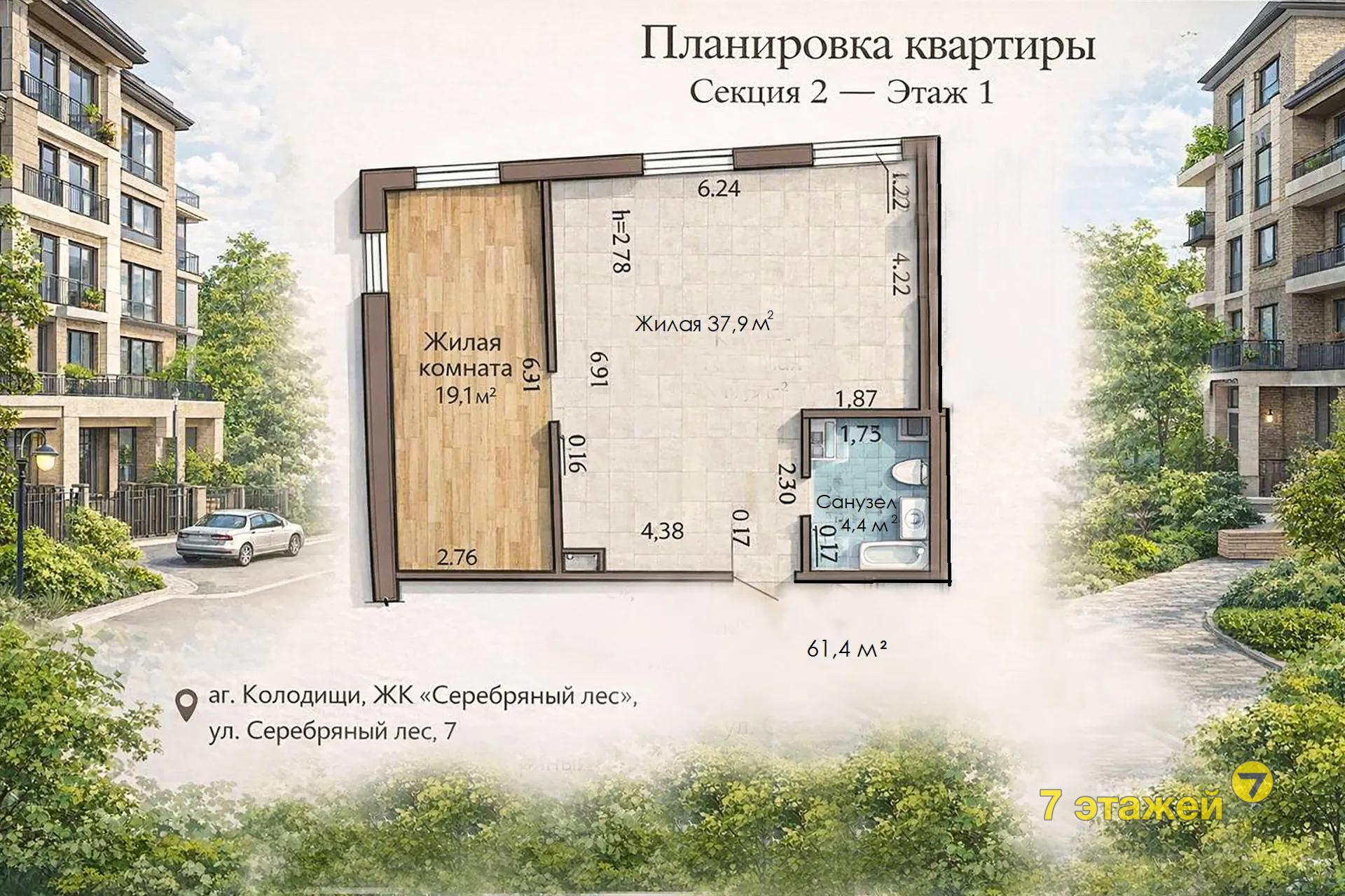 Продаётся современная квартира в новом доме 2024 г. аг. Колодищи, ЖК "Зелёная Гавань", ул. Серебряный лес, 7.Ситихаус 7.13. Площадь квартиры 61,4 м2.